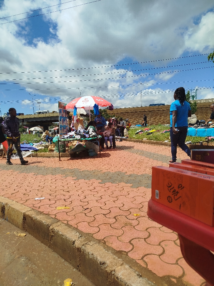 street market in Gitaru, Kenya, located at coordinates -1.232 latitude and 36.676 longitude. The market is set up on a paved sidewalk with red and grey interlocking pavers. A red and white striped umbrella provides shade for a stall selling assorted goods. Several people are present. There are four people sitting at a table underneath the umbrella. A woman in a blue shirt is walking in the center of the image, away from the camera. Two men are walking on the sidewalk, one is facing the camera and one is walking away. Another person is partially obscured by the camera, walking on the sidewalk toward the left side of the image. Several other people are visible in the background, including a person sitting on the edge of the sidewalk. There are several boxes, likely containing the merchandise for sale, stacked in the foreground. The image is taken from a low angle, creating a perspective that emphasizes the distance between the camera and the market. The sky is blue with white clouds. There are several power lines across the top of the image. A concrete wall is visible in the background, and a road and bridge are in the distance. A green grassy area is visible on the other side of the sidewalk. There are several small trees behind the wall.