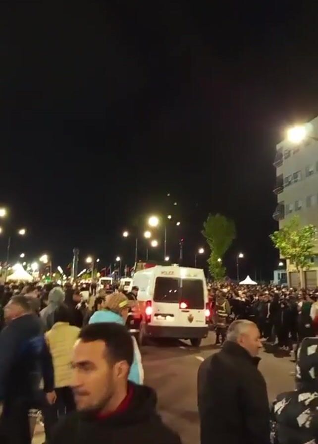 large crowd of people on a street at night. Many of the people are walking, some are standing. There is a white police van in the middle of the street, with its lights flashing. Some police officers in orange vests are present near the van and the crowd. Street lights illuminate the scene. In the background, there is a tall structure resembling a communications tower. The crowd appears to be dense, and the overall atmosphere seems bustling but calm.