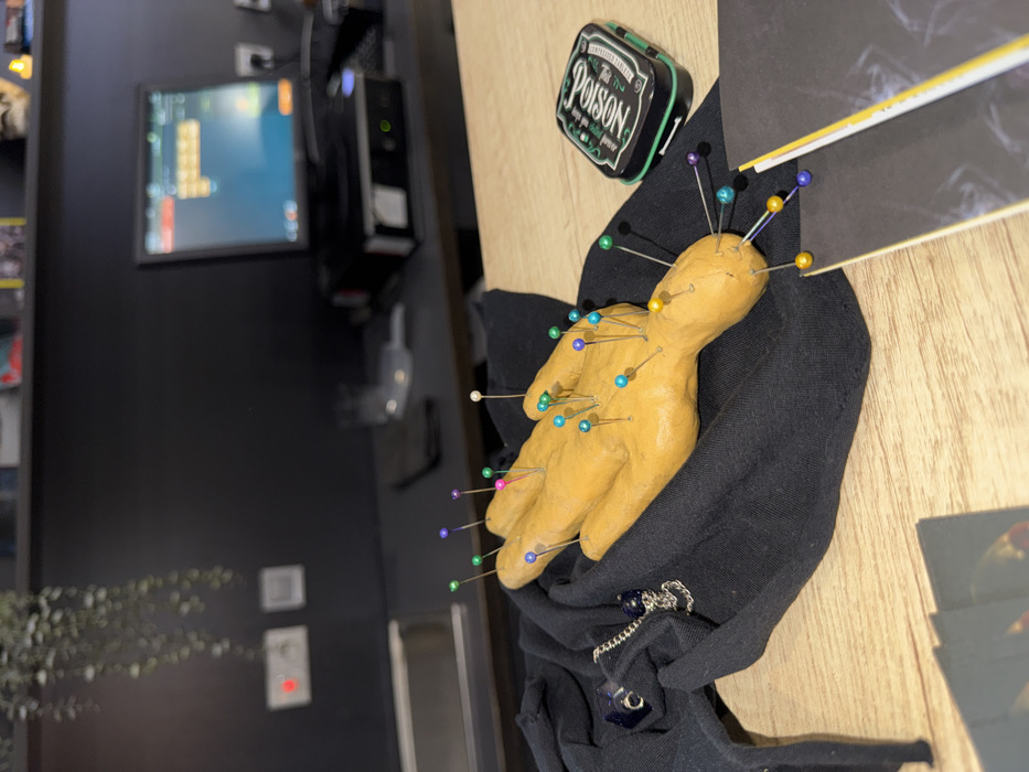 The image displays an indoor scene in Sofia, Bulgaria, centered on a light-colored wooden table. A tan, human-shaped figurine, approximately hand-sized and resembling a voodoo doll, rests on a crumpled black fabric. The figurine is impaled with numerous pins featuring multi-colored spherical heads (blue, green, pink, purple, white, yellow, teal). To the left of the figurine, on the black fabric, a silver chain necklace with a dark blue spherical pendant and a dark blue multi-faceted die are present. To the right of the figurine, a small black tin with a green label displaying "POISON" and a skull-and-crossbones emblem is visible. In the bottom left, a stack of dark-colored cards or booklets is partially visible, and in the bottom right, two open books or magazines with dark covers are partially seen. The background features a dark wall with shelving. On the left, a metal sink is partially visible below a wall outlet with a red indicator light, and a green trailing plant hangs above. To the right, a computer monitor displays an interface with colored blocks, situated above a black computer tower with illuminated green lights. A clear glass and a dark object are also on this shelf.