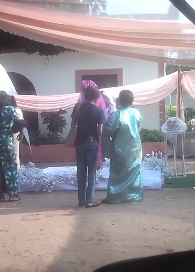 The camera's view, possibly shot from inside a vehicle, peers at a group gathered outdoors. The setting seems to be a celebration or event, suggested by the pink drapes overhead. Three individuals are the focus: one in a turquoise gown, another in jeans and a dark shirt, and one in pink. They seem to be positioned near a table adorned with white decorations. A woman in a leaf-patterned dress stands to the left. The ground is dirt and the event is in front of a white house. The camera is shaky and at one point, a person steps in front of the camera, partially blocking the view.
