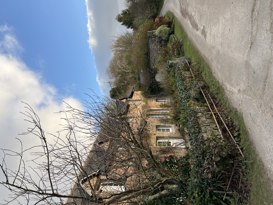 This image depicts a rural scene in Carneville, France, featuring a stone residential structure, extensive vegetation, and a dirt road under a partially cloudy sky