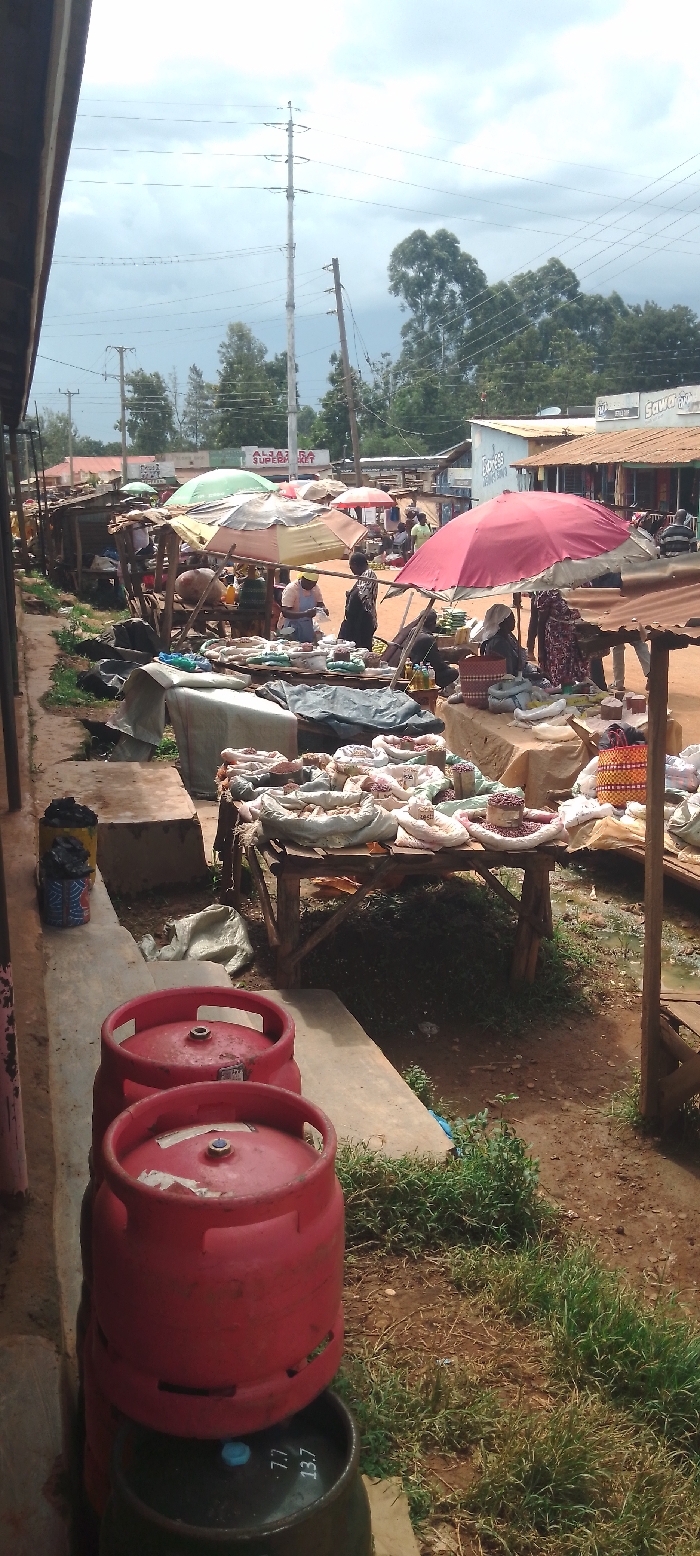 An outdoor market scene in Chevaywa ward, Kenya, is depicted under an overcast sky