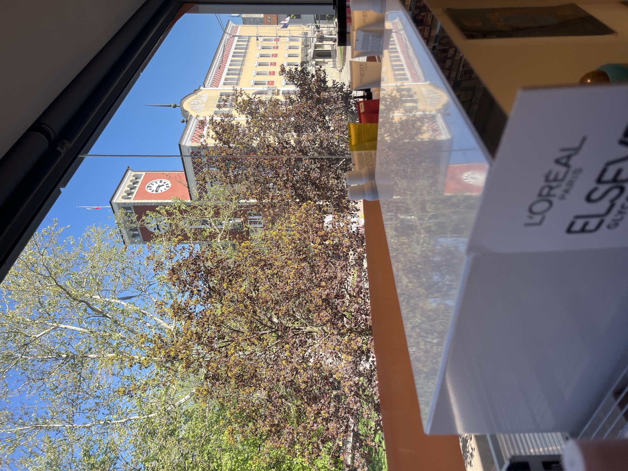 The image, taken from inside a room, shows a view of the city of Haskovo, Bulgaria, through a window. In the foreground, there is a blurred L'Oréal Elvive product advertisement. In the background, two prominent buildings are visible: a tall clock tower with a red roof and white clock face, and a larger, yellow building with architectural details. Green trees partially obscure the buildings, and a clear blue sky is visible above. The scene appears to be taken during the day with natural sunlight.