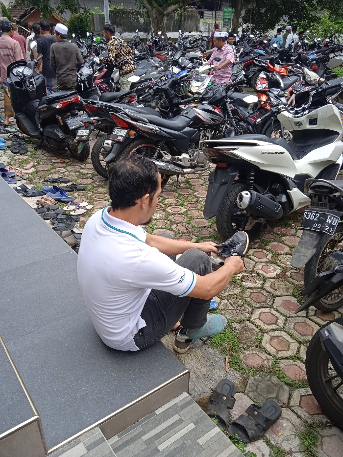 A man in a white shirt and grey jeans sits on a grey step, tying his shoelaces amidst a chaotic motorcycle parking lot. A variety of motorcycles, mostly black, fill the background. Sandals and shoes are scattered on the ground near the steps and motorcycles, suggesting people have removed their footwear. Some individuals wearing skullcaps are milling around in the background, near the motorcycles. The ground is paved with a hexagonal pattern.
