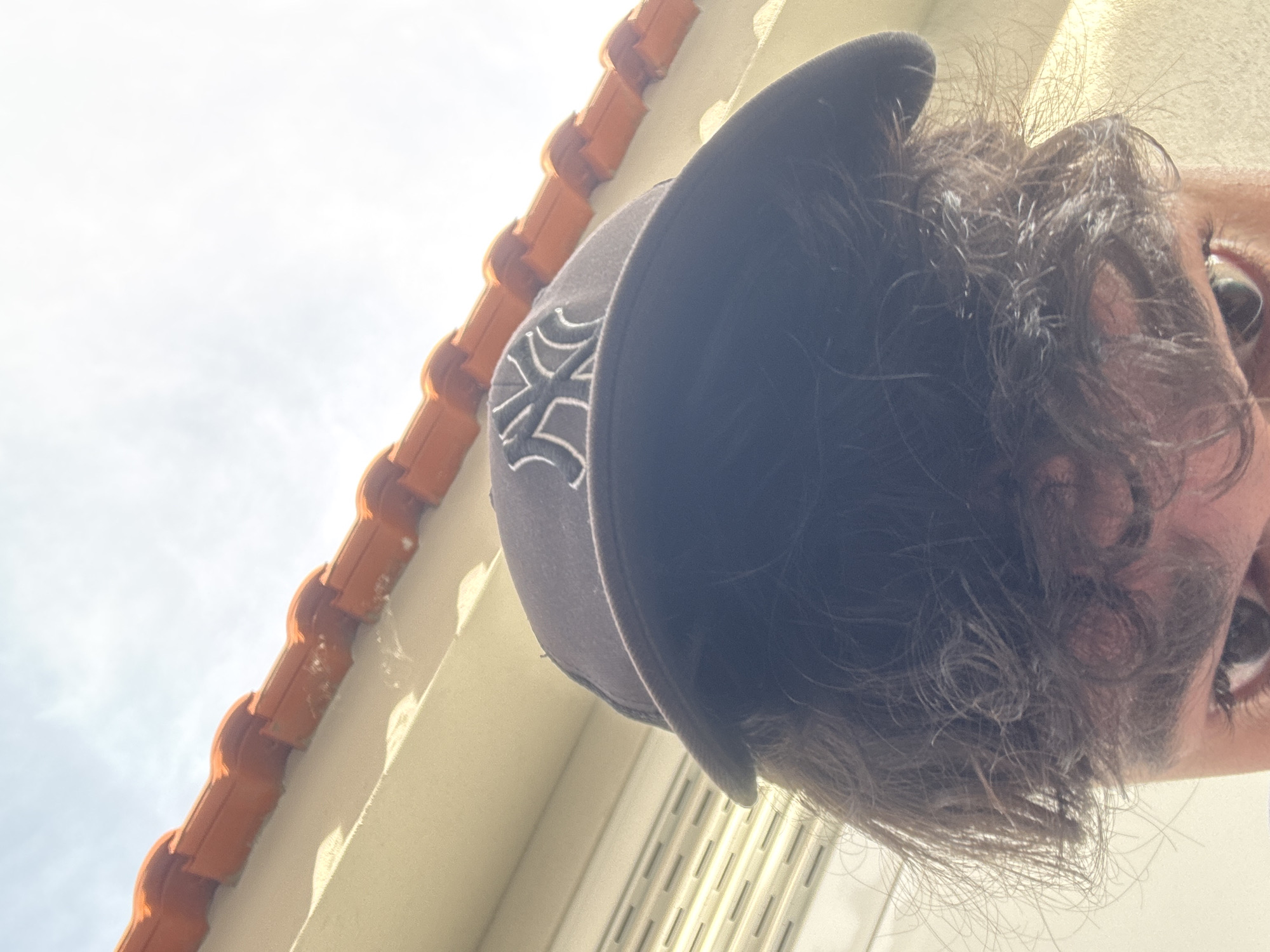 The image depicts a person wearing a dark baseball cap with a light-colored design on the front. The person is looking downwards, with the camera positioned below. Part of a building exterior is visible in the background, including light-colored walls and a roof with orange tiles. The location cannot be determined to be Vila Real, Portugal, with the provided information.
