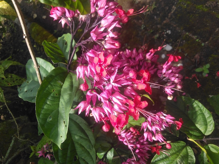 An outdoor, close-up photograph captured in Cipanas, Indonesia, depicts a flowering plant. The central focus is a dense cluster of bright fuchsia-pink flowers, each featuring a prominent pink calyx and a smaller, deep red corolla with visible white stamens. These flowers are attached to dark stems. Several large, ovate green leaves with visible venation are present, predominantly on the left side, some exhibiting small holes. A light brown branch extends horizontally in the upper center. The background on the right consists of a dark, textured surface, consistent with a moss and lichen-covered rock or wall. The upper left background is obscured by dark, out-of-focus foliage. The scene is illuminated by natural daylight. No people or animals are present.