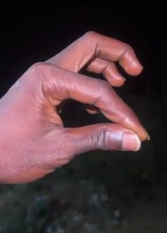 A hand, of dark complexion, is extended in front of a dark background. The hand is making a shape with the fingers, reminiscent of an "okay" sign, but with the pointer finger extended more horizontally. The background seems to be outdoor vegetation under the cover of night.