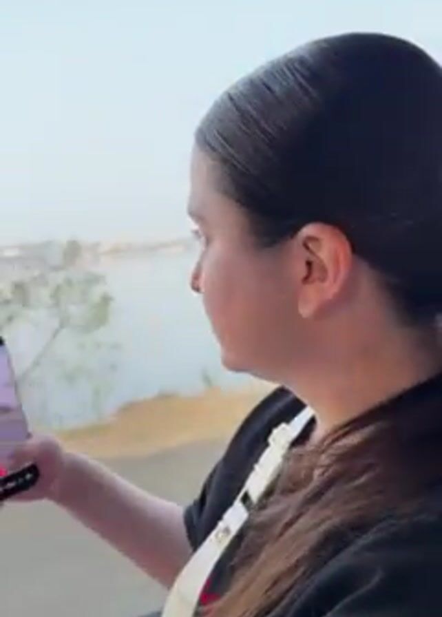 A woman is seen in a moving vehicle by the side of a lake or bay. She is taking a photo with her smartphone. The view is captured through the vehicle's window as it passes by trees and the water's edge. The vehicle has a canopy. The woman is wearing a black t-shirt and has her hair pulled back in a ponytail. The weather appears to be hazy.