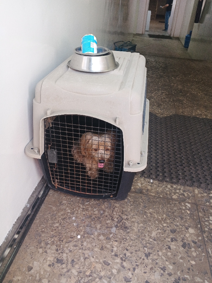 A tan-colored dog with shaggy fur, likely a terrier or spaniel mix, is contained within a beige and black plastic pet carrier. The dog's head is visible through the metal grate door, facing forward with its pink tongue slightly extended. An inverted stainless steel pet bowl rests on top of the carrier, holding a light blue and white cylindrical can or cup. The carrier is positioned on a light-colored, speckled terrazzo or concrete floor against a plain white wall. A dark, textured rubber mat is partially visible on the floor to the right of the carrier. In the background, an indoor hallway extends, where a person wearing a dark shirt and blue jeans stands partially obscured. A blue basket and a blue water dispenser bottle are also visible further down the corridor. The exact location within Abuja, Nigeria, cannot be determined from the provided image.