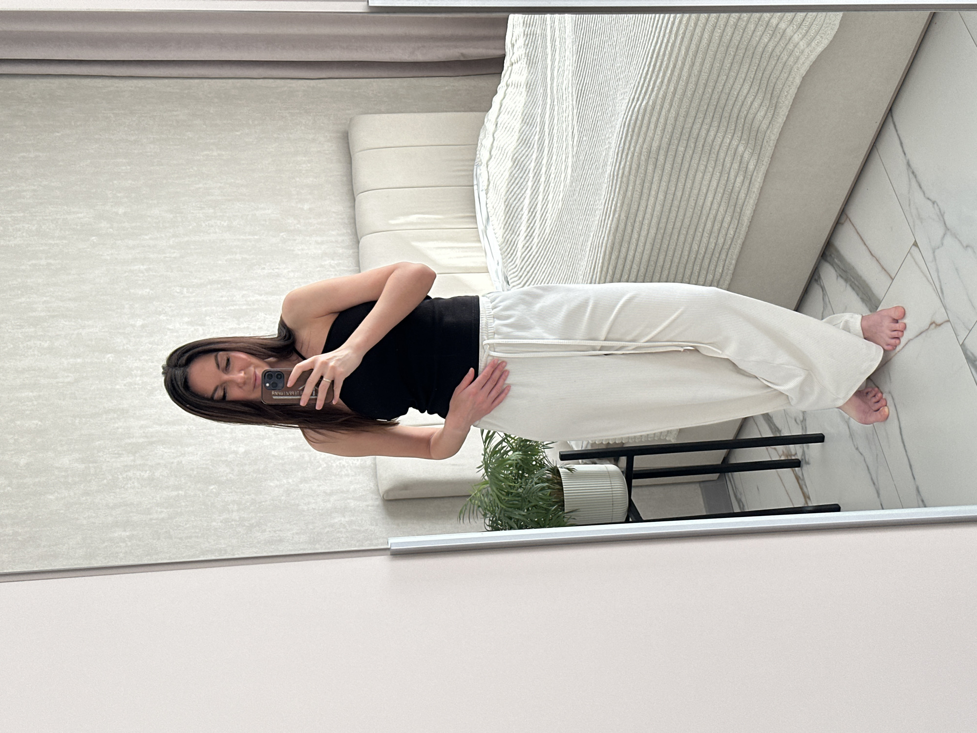 A woman is taking a selfie in a mirror. She is wearing a black tank top and white pants. She is standing in front of a bed with a light-colored headboard and bedding. There is a plant in a white pot on a small black table next to her. The floor is white marble with gray veins. The background is a wall with a light-colored textured surface. The location is not explicitly determined to be Chaikovsky, Russia, based on the image content.