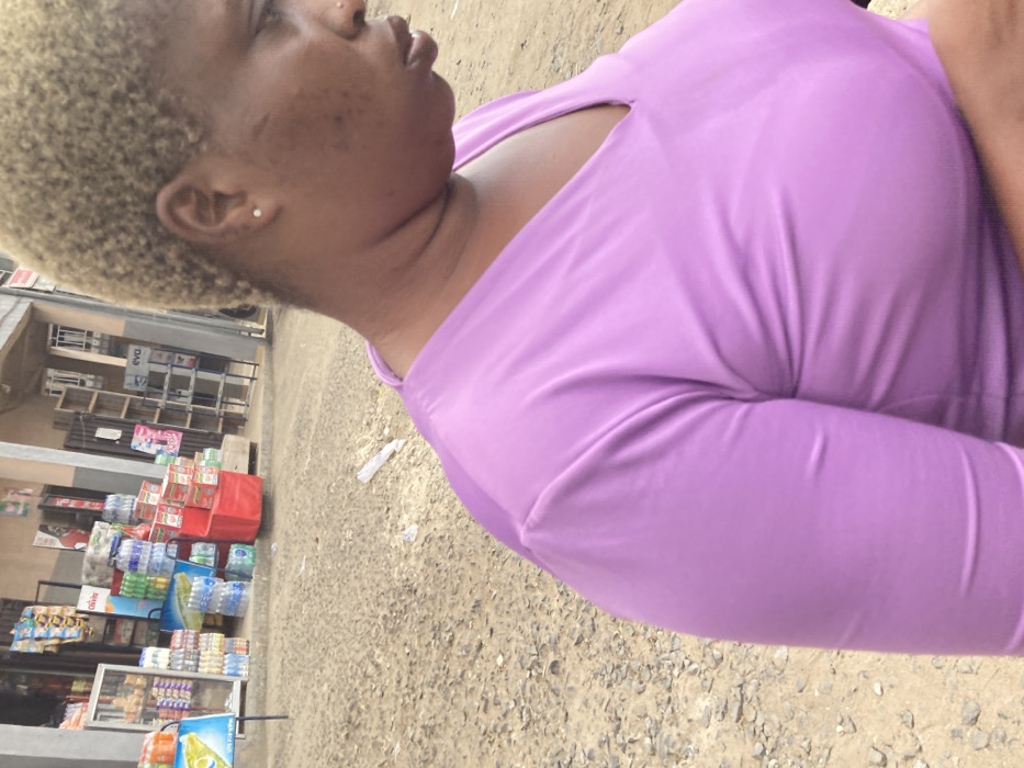 An outdoor scene captures a partial view of a dark-skinned individual and a busy street environment, likely a commercial area in a city within Unknown, Nigeria. **People:** The primary subject is an adult female, visible from the mid-chest upwards, oriented in profile facing right. She has short, light blonde or bleached curly hair. Her visible left ear has a small, round white earring. Her skin exhibits several small dark blemishes or marks on the left cheek and temple area, with what appears to be a linear scar or mark above her left eyebrow, partially obscured by hair. A small nose ring is visible on her right nostril. She is wearing a light purple, V-neck long-sleeved shirt. Her gaze appears to be directed downwards or slightly forward, out of frame. No specific actions or interactions are clearly depicted for the individual, she appears to be stationary or in motion. **Environment and Objects:** The background reveals a street or unpaved thoroughfare with a rough, gravelly surface, indicating a dirt or stone-filled ground. To the left, a portion of a sidewalk or raised concrete curb is visible. Behind the individual, a small storefront or kiosk is present, displaying various consumer goods. These include multiple cases and bottles of beverages (water, soft drinks), stacked in front of and inside what appears to be a glass display case. Items resembling packaged snacks or biscuits are also visible. A red rectangular object, possibly a trolley or display stand, is laden with boxes, possibly containing packaged food items like noodles. Further back, another building with a gray facade and barred windows or security gates is visible. A white plastic bag is discarded on the ground in the middle distance. Signage, including one partially visible with "EVA" written on it, suggests commercial activity. The overall lighting suggests daylight.
