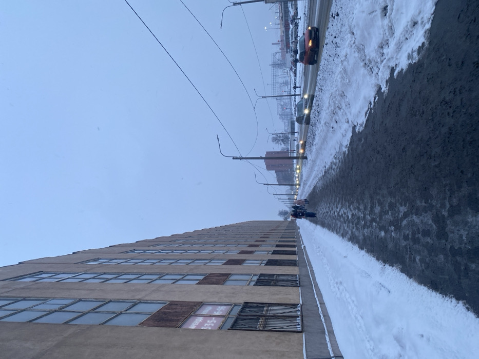 A tall, light-brown building with many windows is on the left. An advertisement hangs in one window. A sidewalk covered with snow runs alongside the building. A snow-covered street stretches into the distance on the right with a line of cars and streetlights. Powerlines are overhead against a cloudy sky. In the distance, more buildings and electrical equipment are visible. Two people are walking down the sidewalk.