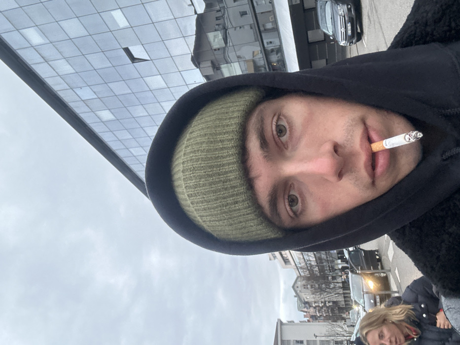 An individual is depicted in a close-up, chest-up vertical photograph on an overcast day in Annecy, France. The central subject is a young male, appearing to be in his 20s or early 30s, looking directly forward with a neutral expression. He wears an olive green knit beanie beneath a black hooded sweatshirt with a visible textured, possibly sherpa or fleece, exterior. A lit cigarette, featuring a small skull design on its filter end, is held between his lips. To the subject's immediate left, partially visible, is a blonde female with an open-mouthed expression, wearing a dark puffer jacket with red accents. Behind her, a street scene unfolds with multiple vehicles, including a dark-colored car with illuminated headlights. Older-style residential or commercial buildings line the street, characterized by multiple stories and traditional European architecture. To the subject's right and extending into the background, a large, modern building with a reflective glass facade is prominent. One window on this building's upper story is slightly ajar. Reflections of the overcast sky and other structures are visible in the glass. A dark-colored sedan, possibly a Volkswagen Golf, is parked on the street or in a parking area in front of this modern building. The sky is uniformly grey and overcast, indicating a cold or cool ambient temperature. The scene is an urban street environment consistent with a city setting like Annecy.