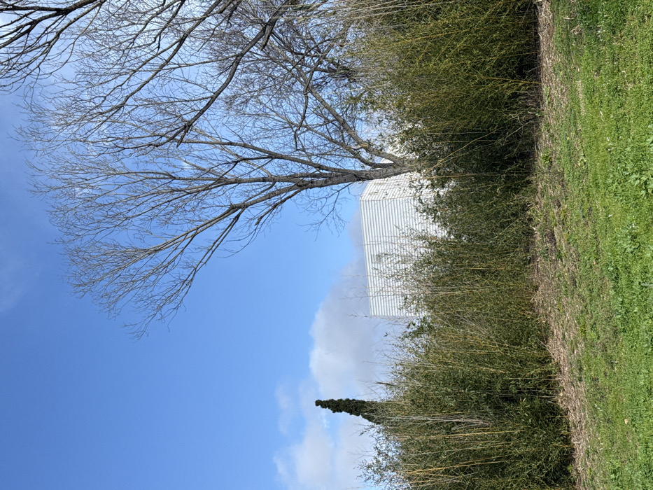 The image depicts an outdoor scene under a clear blue sky with scattered white clouds, consistent with a daytime setting in Tarragona, Spain. In the foreground, a strip of green grass and dry soil is visible. The midground is dominated by a dense stand of tall, green bamboo, partially obscuring the view. To the left, a slender, dark green, cypress-like tree stands prominently. Multiple large, bare deciduous trees with intricate branching patterns are visible, primarily on the right side and extending upwards into the sky. In the background, behind the vegetation, a substantial, multi-faceted white building with horizontal corrugated or ridged siding is visible. It features several dark, rectangular openings or windows on its upper sections. No people, animals, or specific actions are discernible in the scene. The environment appears to be a mix of natural vegetation and a distant man-made structure.