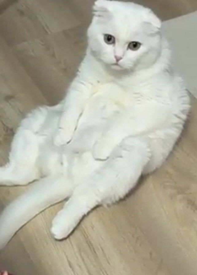 white, Scottish Fold cat sitting on a wood floor. The cat is sitting in an unusual posture, with its hind legs splayed out and its front paws resting on its belly. The cat has light green eyes and a pink nose. It appears to be looking directly at the camera. A floral print cloth is partially visible in the corner of the frame. Background audio includes speech.