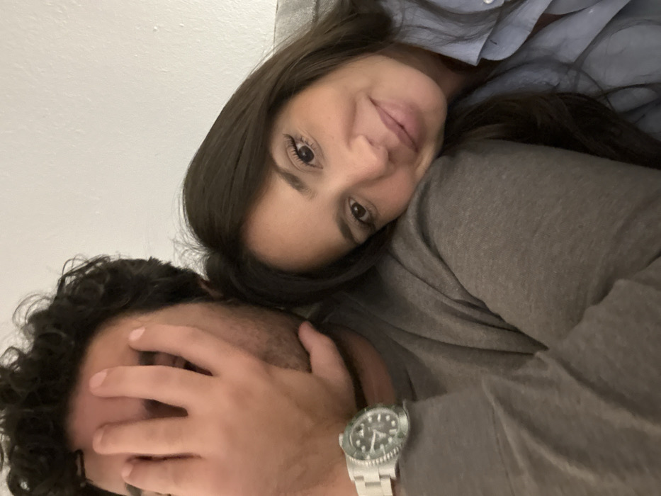 A couple poses intimately, lying down. A woman with long, dark hair and brown eyes smiles slightly toward the camera. She wears a light blue shirt. A man with dark, curly hair covers his face with his hand. His left wrist bears a silver watch with a dark green face. They appear comfortable and close. A pale wall or ceiling acts as the background. The overall tone is casual and intimate.