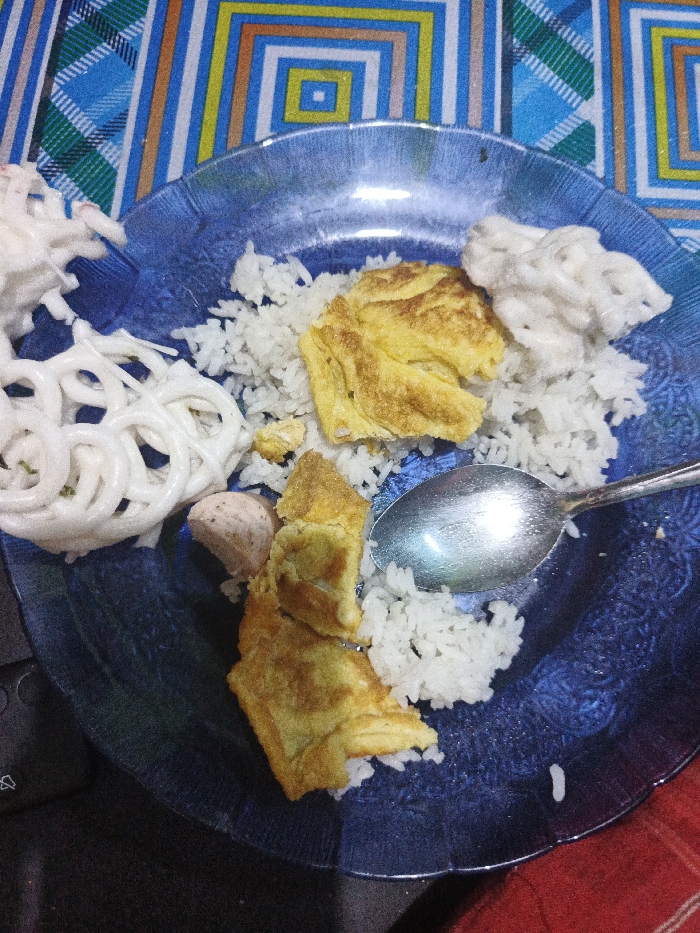 - "A blue, translucent glass plate holds a meal consisting of white rice, several pieces of a folded yellow omelet, multiple white, irregularly shaped crackers, and one slice of a pale pinkish-grey cylindrical processed meat" by FM-QNzWw2, licensed under CC BY 4.0