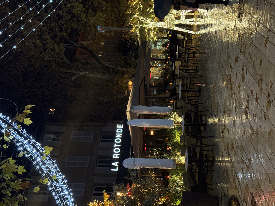A nighttime view of the restaurant "La Rotonde." Tables and chairs line the outdoor patio, some covered with white cloths. The pavement is wet, reflecting the light from strings of lights and illuminated trees. The restaurant sign glows brightly against the building facade. Decorative light displays add to the festive atmosphere. A person holding an umbrella is visible near the top.