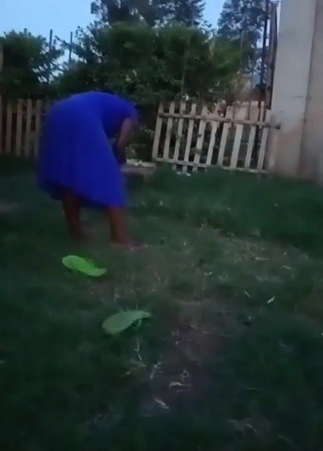 A woman in a blue dress is bending over in a grassy backyard, possibly picking something up. Her green sandals are lying on the ground. A wooden fence is behind her, and the sky is dusky.