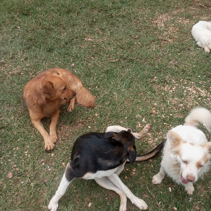 - "The scene, located in Mahiakalo ward, Kenya, depicts four domestic canines on a surface of green grass intermixed with scattered light-colored wood chips or debris" by FM-iEAFO2, licensed under CC BY 4.0