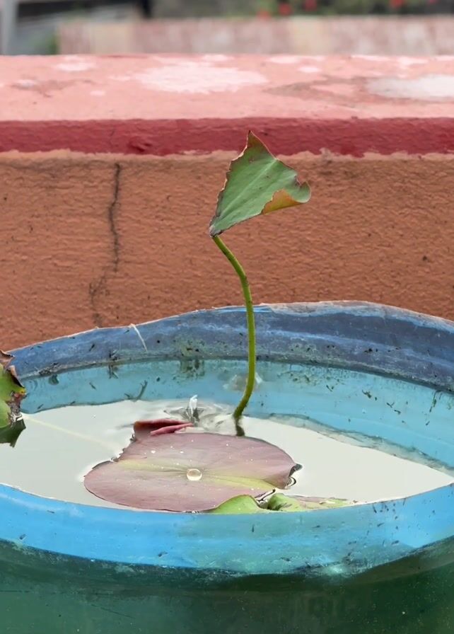 close-up of a small, green and brown lotus plant in a blue and green plastic pot filled with water. The pot is sitting on a rooftop or balcony, as evidenced by the low wall in the background. The lotus plant has one large, reddish-brown leaf floating on the surface of the water, with a single water droplet on it. A single, slender stem rises from the water, supporting a small, slightly damaged green leaf at its tip. There is a slight breeze causing ripples in the water. The background is blurred, but appears to be a residential area with buildings and greenery.