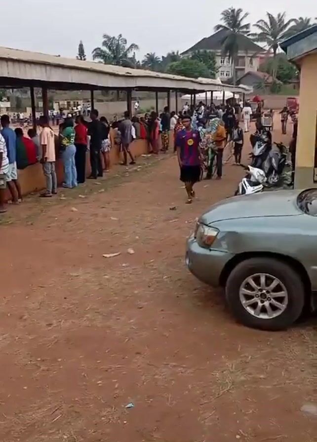 gathering of people on a dirt ground, with a covered structure providing shelter