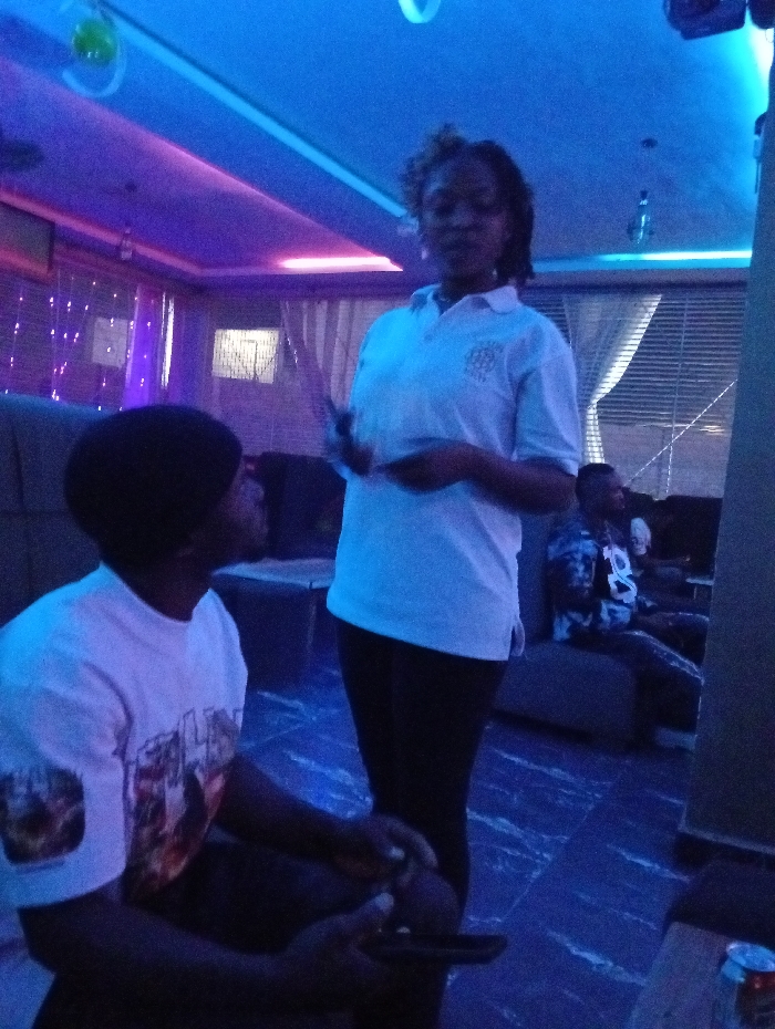 A man sits, gazing up at a woman standing, holding an object, in a room lit with blue and purple. The woman wears a light-colored polo shirt and dark pants. The man wears a light-colored t-shirt. A second man sits on a couch in the background. There are sheer curtains and light strings. The flooring is marbled. A can sits on the floor next to a chair.