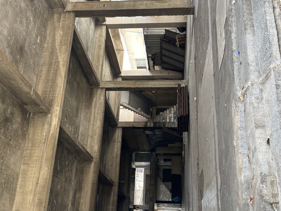 The image displays the ground floor of a disused concrete structure situated in Samrong Nuea Subdistrict Municipality, Thailand