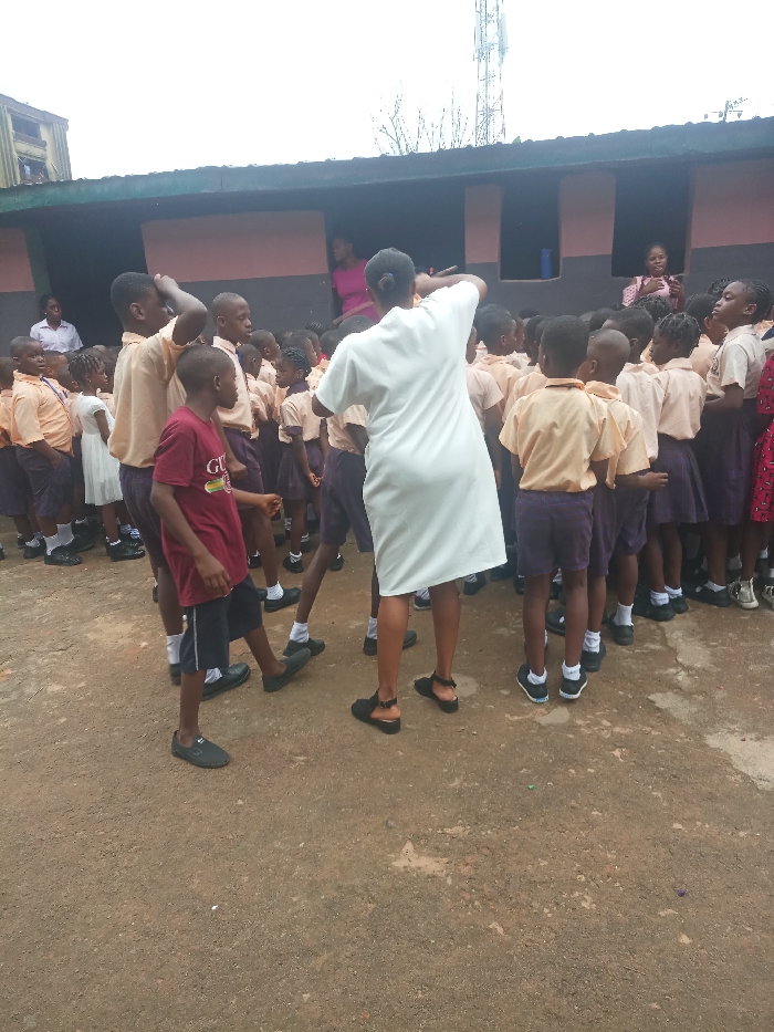 The image depicts an outdoor assembly in a dirt and gravel courtyard within the city of Unknown, Unknown, adjacent to a single-story building. Approximately 30-40 individuals are present, predominantly children. A dark-skinned adult female, wearing a plain white dress and black flat sandals, stands with her back to the camera, arms raised, facing a crowd of approximately 35-40 primary school-aged children. These children wear light beige or yellow short-sleeved shirts, dark blue or purple shorts/skirts, white socks, and dark shoes, forming an informal group. One male child in the foreground wears a maroon t-shirt with a yellow graphic and dark shorts, distinct from the uniform. The single-story building features a dark roof and segmented walls with several open, unglazed window-like frames. Two adult females are visible within these openings; one on the right holds a mobile phone, and one on the left observes. In the background, above the building, a metal cellular tower is visible on the right, and a multi-story, weathered concrete building is partially observable on the far left. The sky is uniformly overcast.