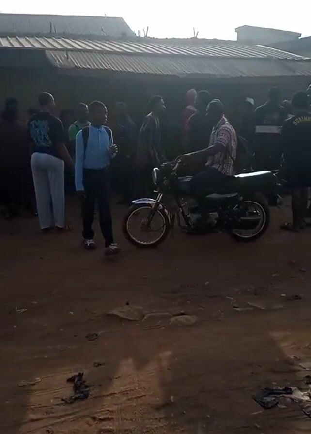 group of people standing on a dirt road in front of a building with a corrugated metal roof