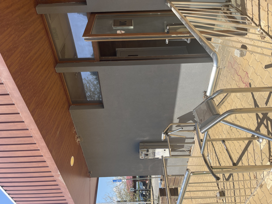 entrance to a public restroom located in Nova Zagora, Bulgaria at the coordinates provided. The restroom is part of a larger building with a wooden facade, and a gray concrete wall. The entrance is marked with a sign reading "WC." There is a metal turnstile, which appears to be broken, in front of the entrance. The restroom is accessed through a door, with a glass panel, that is currently open. The area around the restroom is paved with yellow brick. The metal railing leads to the restrooms. The building appears to be in good condition. The surroundings are bright and well-lit, indicating a sunny day. There are no people present in the image.