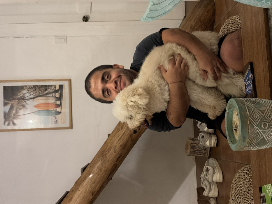An indoor scene, presumably within a residence in Ayampe, Ecuador, depicts a male individual embracing a white dog