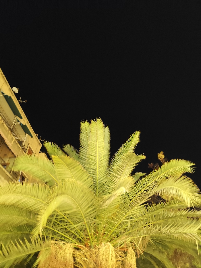 The image depicts a nighttime scene in Joubar Municipality, Syria. A large palm tree occupies the lower two-thirds of the frame, its dense fronds illuminated with a vibrant yellow-green artificial light against a deep black sky. In the upper left quadrant, a portion of a multi-story building is visible, featuring light-colored walls, multiple balconies with dark undersides, and a white, circular satellite dish mounted on its exterior. There are no people or discernible actions. The environment suggests an urban or suburban setting at night, with artificial lighting accentuating the foliage of the palm tree and parts of the building.