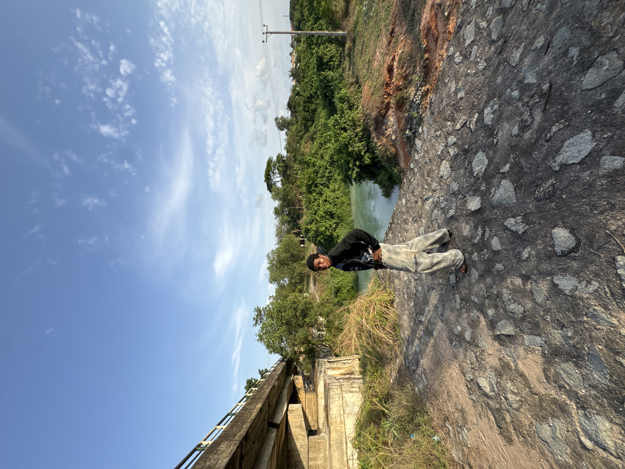 A person stands on a stone bridge in Ihiagwa, Nigeria. The person wears a black shirt and light-colored pants. A river with green-tinted water flows below the bridge. The environment includes trees and vegetation on the banks of the river. The sky is blue with scattered clouds. Power lines and a pole are visible in the distance. The bridge surface is composed of large stones.