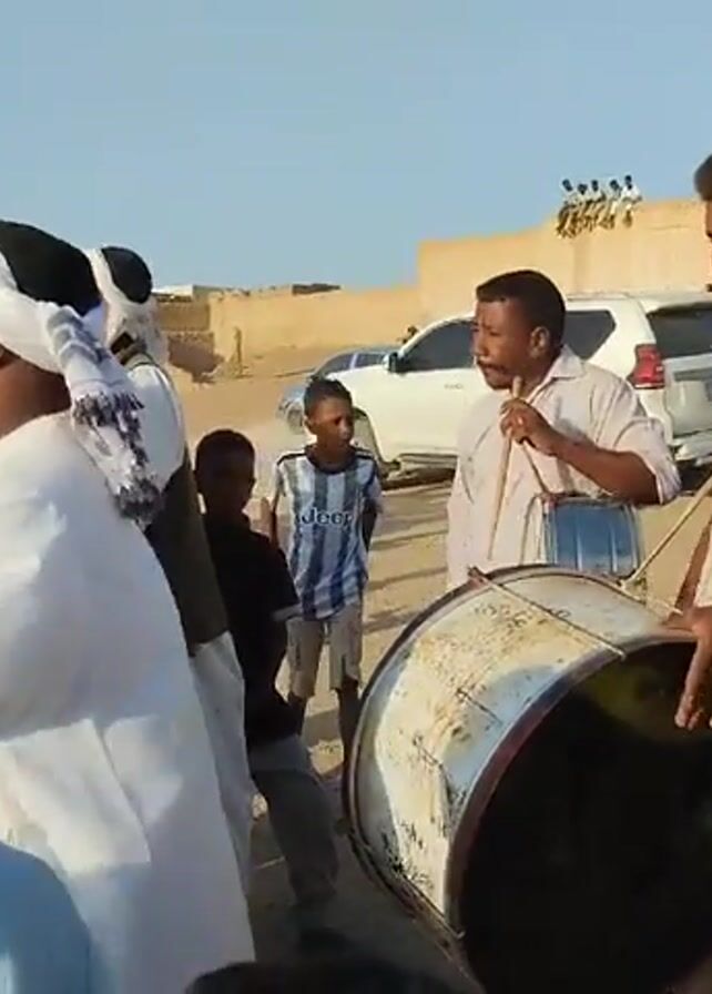 The video captures a lively street performance in what appears to be a desert-like setting. Several individuals are gathered around a musical ensemble. A man dressed in traditional white attire and a turban is actively singing. Next to him, two other men are engaged in playing percussion instruments, including a large drum. One individual is playing with drumsticks. The scene is filled with people of all ages, many of whom are looking at the musicians. A car is parked in the background. The overall atmosphere seems celebratory and joyful, as the community appears to be enjoying the performance.