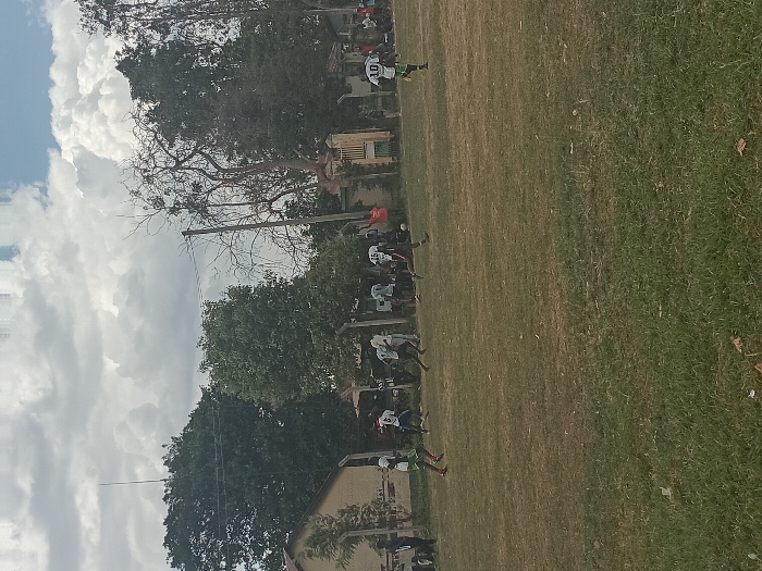 A group of people wearing jerseys are running across a grassy field. The people are dressed in white jerseys and green shorts. Trees are scattered around the edge of the field. The sky overhead is partly cloudy.