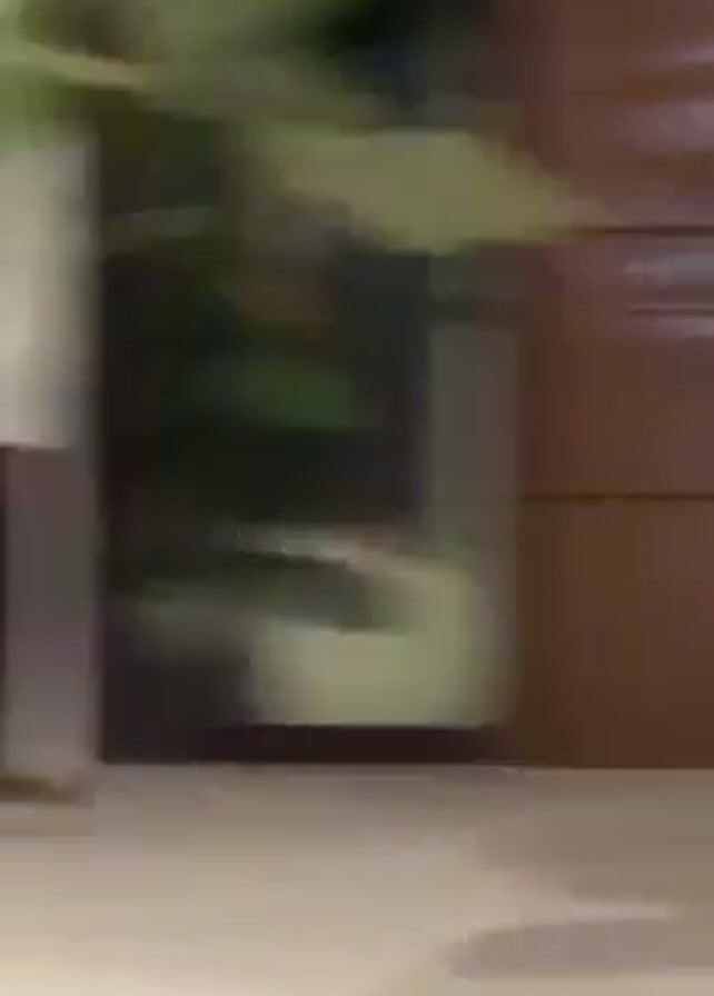 A small frog sits on a white tile floor. A person wearing denim shorts quickly moves toward the frog. A potted plant and a brown door are in the background.