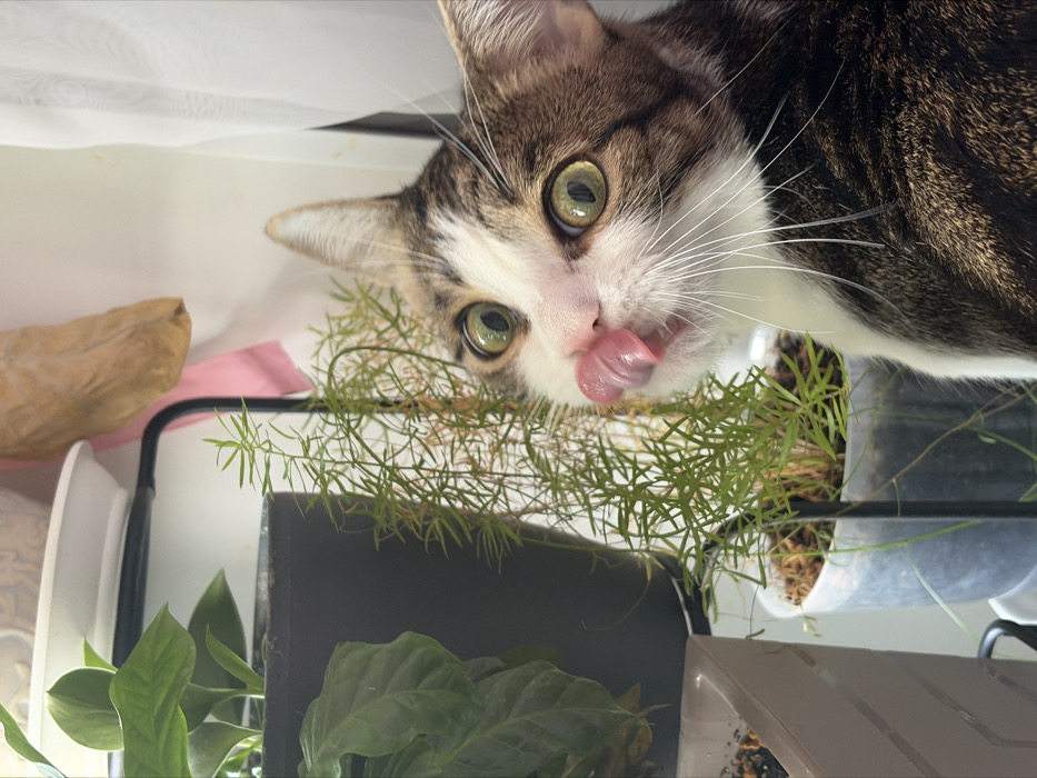 The image depicts a domestic cat in an indoor setting within the city of Lipetsk, Russia. The cat, exhibiting a tabby and white fur pattern with prominent green-yellow eyes, is positioned on the right side of the frame, facing forward. Its pink tongue is extended and curled upwards, actively licking its nose. Long white whiskers are visible on its muzzle. The background and left foreground are occupied by various potted plants. On the far left, a plant with large dark green leaves is contained within a dark pot. Adjacent to this, a plant with delicate, feathery light green foliage is housed in a clear plastic cylindrical pot. Another light-colored pot is partially visible in the bottom-left corner. A black metal support structure is visible behind the plants. In the upper background, a white plate or saucer is present, and to its right, a light brown object, possibly fabric, hangs alongside a pink strap. A sheer white curtain borders the right edge of the frame, behind the cat. The scene is brightly illuminated.