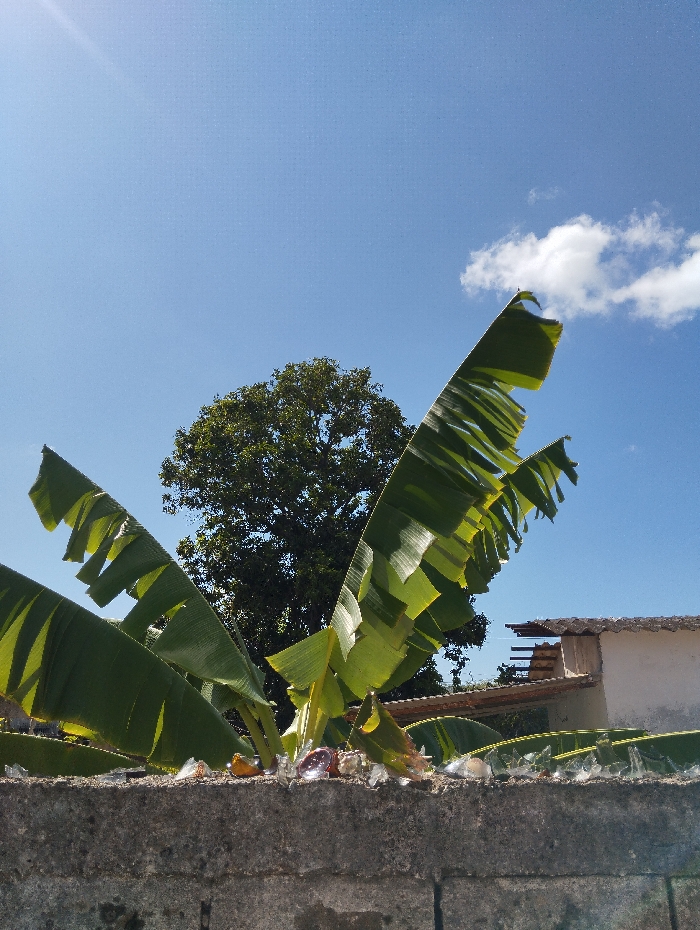 A lush banana plant rises behind a concrete wall, its vibrant green leaves reaching towards a clear blue sky dotted with a few white clouds. A large tree fills the space behind the banana plant, adding to the natural backdrop. The wall is topped with an assortment of glass shards, possibly for security. In the background, the roof and side of a building can be seen, suggesting a residential area.