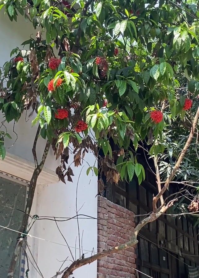 tree with red flowers growing beside a white building with a window