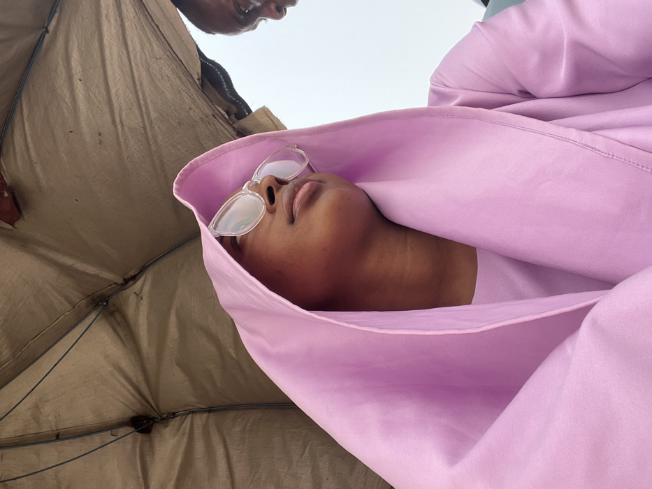 The image displays two individuals situated beneath a large, open, tan-colored umbrella or canopy. The primary subject, located in the foreground, is a person with dark skin, seen from the chest up. This individual wears a light purple hooded garment and clear-framed eyeglasses, with their head tilted slightly upward and eyes directed towards the upper right. A second, partially visible individual, identified as male with dark skin, is present on the far right edge of the frame, showing only a portion of his face, oriented towards the left. The internal structure of the umbrella, including its ribs, is discernible above the subjects. The scene appears to be outdoors in diffused daylight, under the shade provided by the umbrella. No specific visual cues are present to identify a precise location within the city of Gwagwalada, Nigeria.