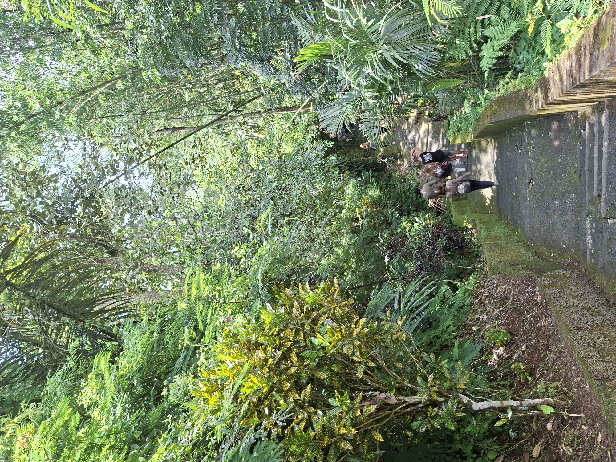 The image depicts a view from above, looking down a set of concrete steps. The steps are aged, with moss growing on the edges. Three people stand on the steps, one lying down, one with long blond hair, and one with a green shirt. Lush green vegetation surrounds the steps, including ferns, palms, and a bush with yellow and green leaves. The location is Petang, Indonesia. The image appears to be taken in a forested area, likely a tourist spot or park.