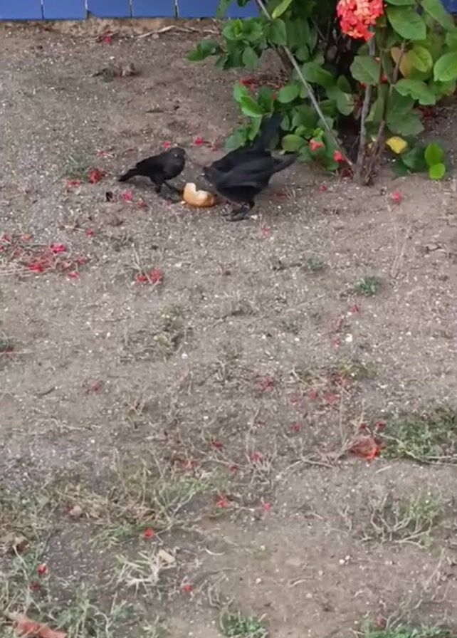 In a mid-shot, three small black birds stand on the ground. They gather around a piece of bread, pecking at it. The ground is a mix of dirt and small stones, scattered with tiny red flower petals. Behind the birds, a small green bush with red flowers grows near a blue wooden fence.