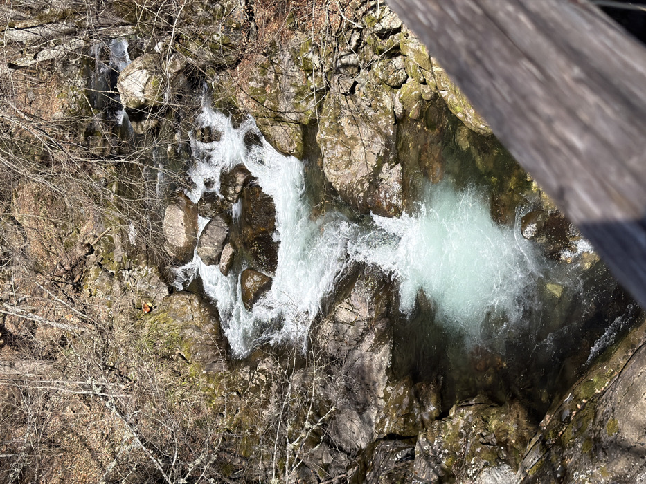 An elevated view captures a rocky mountain stream located within the Rilski manastir region of Bulgaria. The fast-flowing water, characterized by white rapids and turquoise-tinted pools, courses over and around numerous large and small boulders. Both banks of the stream are steep and heavily wooded, displaying mostly bare deciduous trees with scattered dry leaves and moss-covered rocks. A small, bright orange object is visible on a moss-covered rock ledge on the left bank, mid-frame. Bright sunlight illuminates the scene, casting shadows. A blurred wooden structure, consistent with a bridge railing, occupies the lower right foreground. No human figures are discernible.