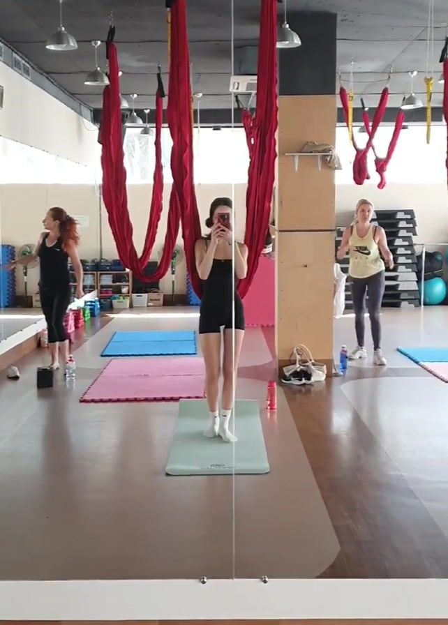 The video captures a mirrored view of a yoga studio or fitness center