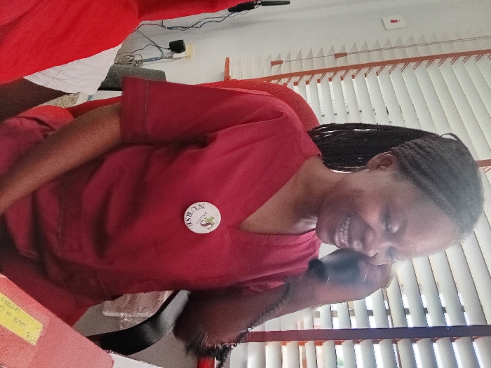 This indoor scene, located in Lokoja, Nigeria, depicts a female individual, appearing to be of African descent, seated and engaged in a telephone conversation. She possesses dark braided hair styled into a ponytail and is observed smiling while holding a black landline phone receiver to her right ear with her right hand. The subject is attired in a red V-neck scrub top, on which a circular white badge is affixed to her left chest, displaying the word "NURSE" and a "BOLUDO S" logo. She is seated in a red office chair. In the lower right foreground, a red file folder rests on a desk surface, featuring a yellow sticky note with partially visible handwritten text, including "LETTERS". The background is characterized by white horizontal window blinds, partially open, allowing natural light to illuminate the area. A wall outlet and associated wiring are visible on the left wall. A segment of red fabric, potentially belonging to another person or object, is visible on the far left.