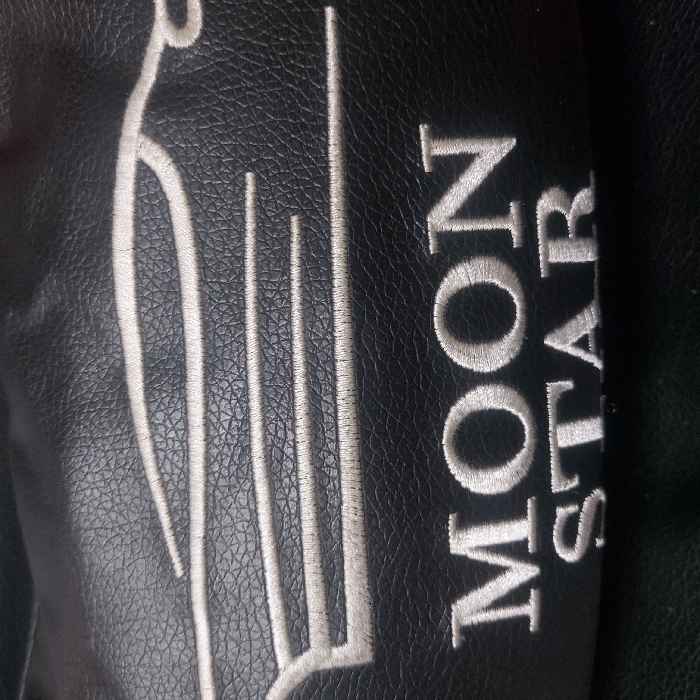 A close-up image reveals a black, finely textured surface, consistent with faux leather or leather material, located in Gimpo City, South Korea. Embroidered in white thread are two distinct elements. The upper element is a stylized, elongated silhouette of a car, depicted in profile and facing right, with horizontal lines forming its body. Below this emblem, the words 'MOON STAR' are embroidered in two lines of capital letters, with 'MOON' positioned above 'STAR'. No individuals, interactions, or specific environmental details beyond the textured material are discernible.