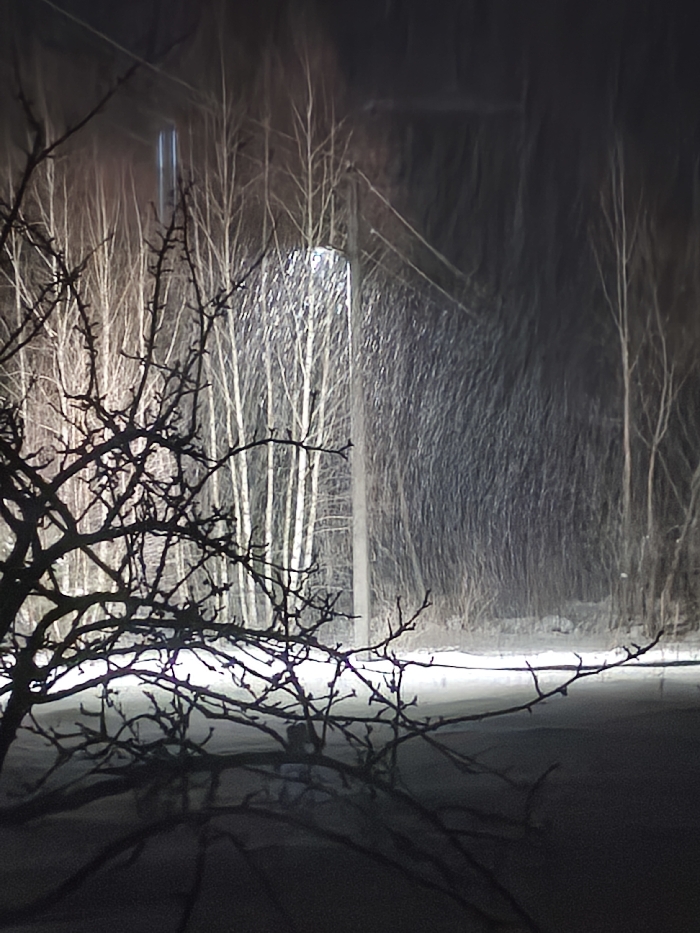 - "A stark winter scene unfolds with snow illuminated by a streetlight amidst slender trees" by FM-x32VB2, licensed under CC BY 4.0