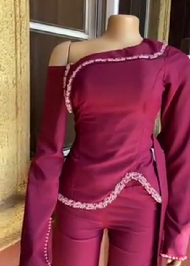 mannequin wearing a dark pink, two-piece pantsuit with beaded trim. The suit has a one-shoulder top with a long sleeve on one side. The background features a window and a textured yellow exterior wall. The mannequin is the main focus of the video.