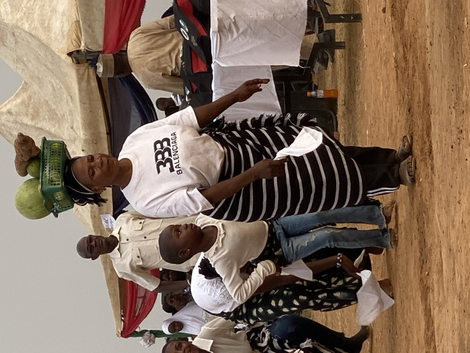 A woman wearing a Balenciaga t-shirt and black-and-white striped skirt carries a basket of fruit on her head. Several people are seated below, including a child in a white top and blue jeans. Others are dressed in lighter colors. The setting appears to be outdoors, possibly a market or event. A tent structure is visible in the background.